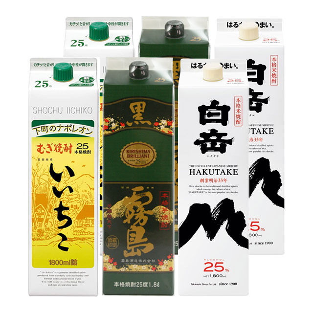 【送料無料】黒霧島 25度・いいちこ 25度・白岳 25度 パック 飲み比べセット 1800ml 各2本 計6本