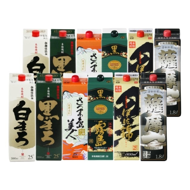 【送料無料】人気芋焼酎パックセット(黒霧島・黒伊佐錦・島美人・薩摩一・黒まろ・白まろ)25度 1800ml×各2本 計12本
