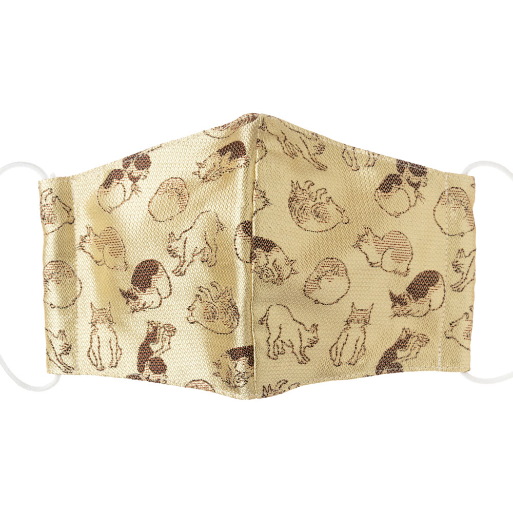京都 あらいそ 西陣織名物裂 和装マスク008 ねこ尽くし文様 淡黄 正絹織物とガーゼを組み合わせた和風スタイルマスク 男女兼用 ...