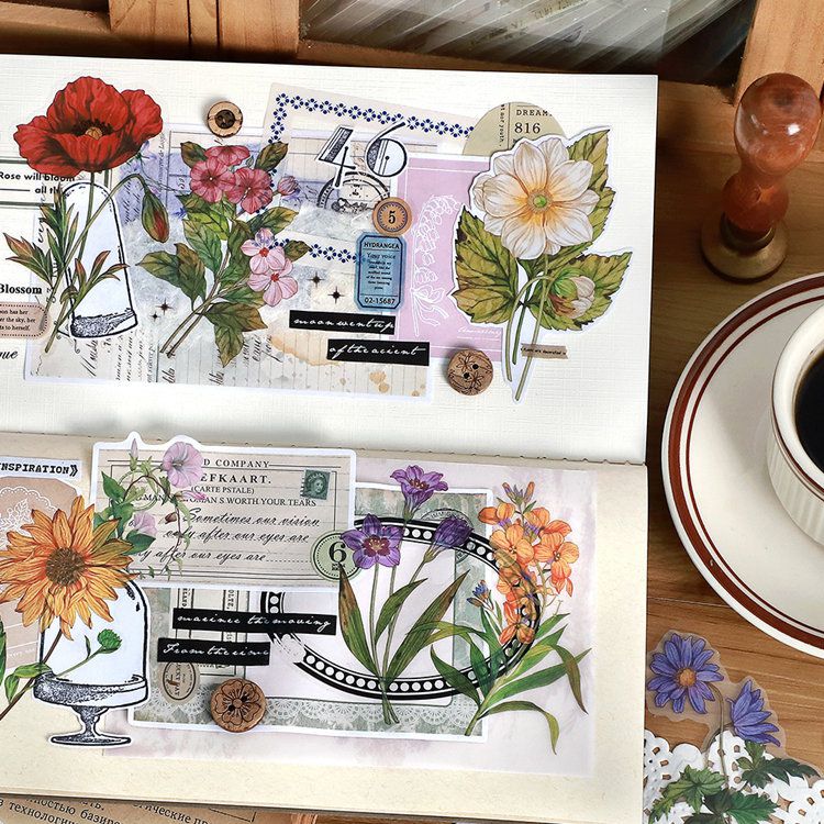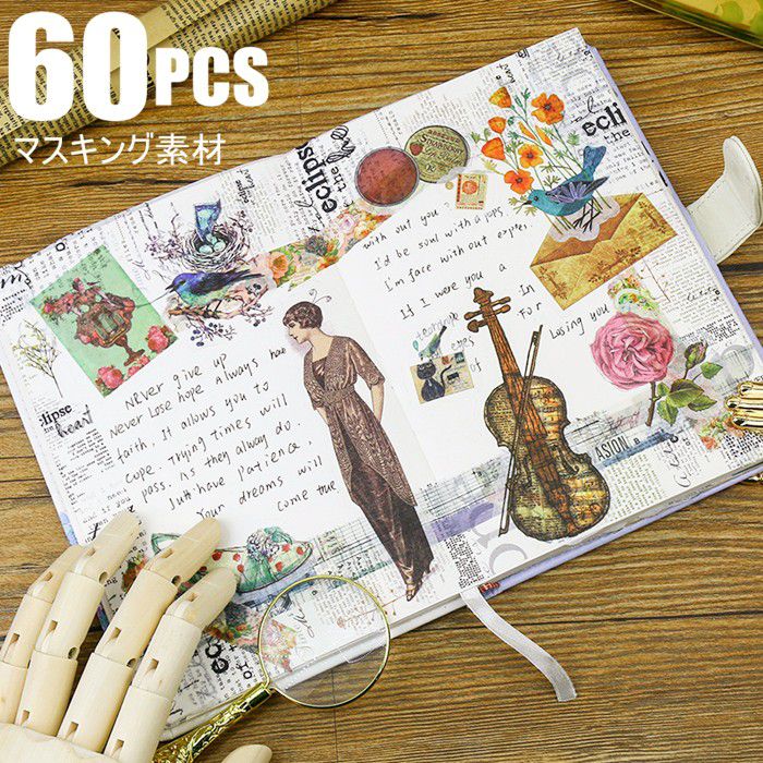 即日発送 マステシール 60枚 大容量 大きめ レトロ コラージュ 素材 シール 花柄 ローズ 人物シール 英語シール 生活雑貨 ...
