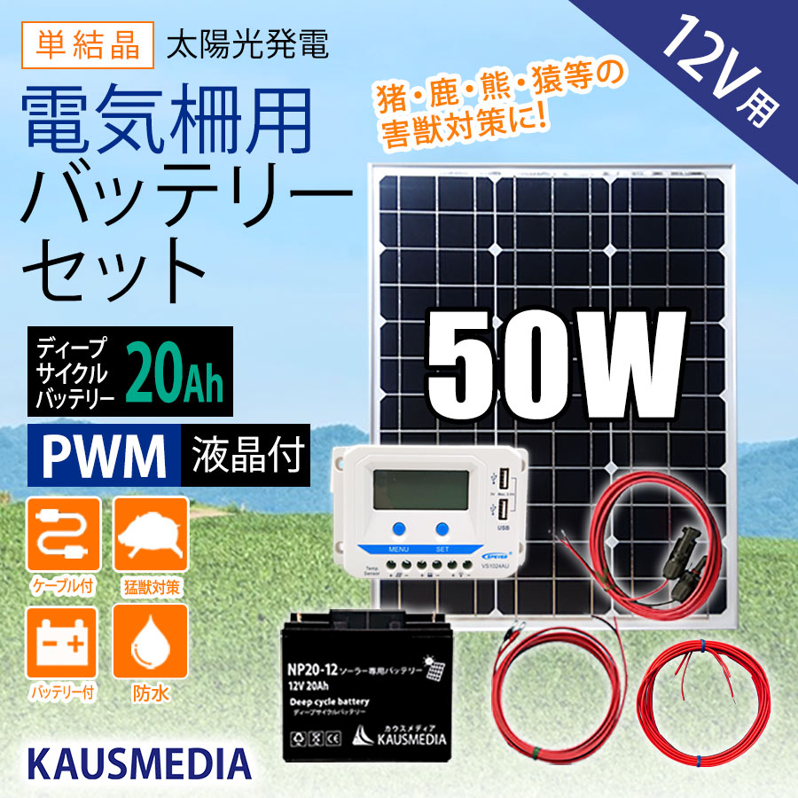 50W ソーラー充電 電気柵用 バッテリーセット 20Ah ディープサイクルバッテリー 液晶画面付き