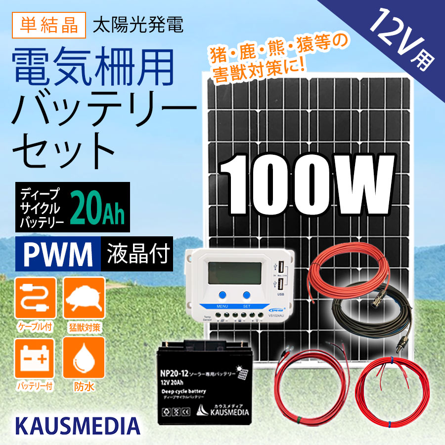 100W ソーラー充電 電気柵用 バッテリーセット 20Ah ディープサイクルバッテリー 液晶画面付 チャージコントローラー