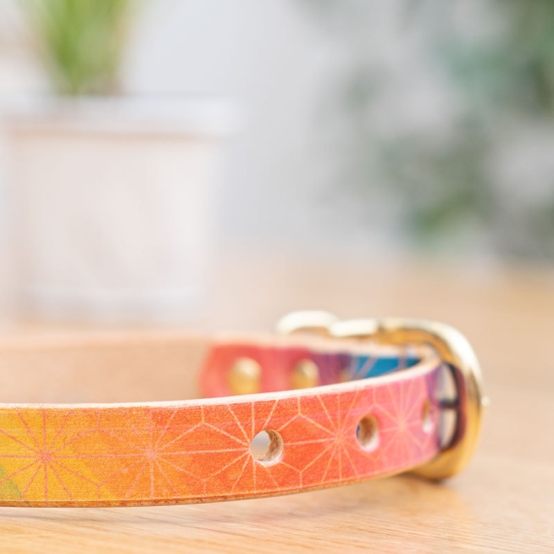 Framer アートなグラフィック本革首輪 麻柄レインボー水彩 真鍮無垢金具 サイズSS~L ベルト幅16mm #23474