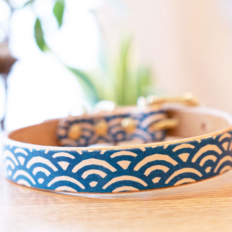 Framer アートなグラフィック本革首輪 青海波文様 版画タッチ(青) 真鍮無垢金具 サイズSS~L ベルト幅16mm #234...