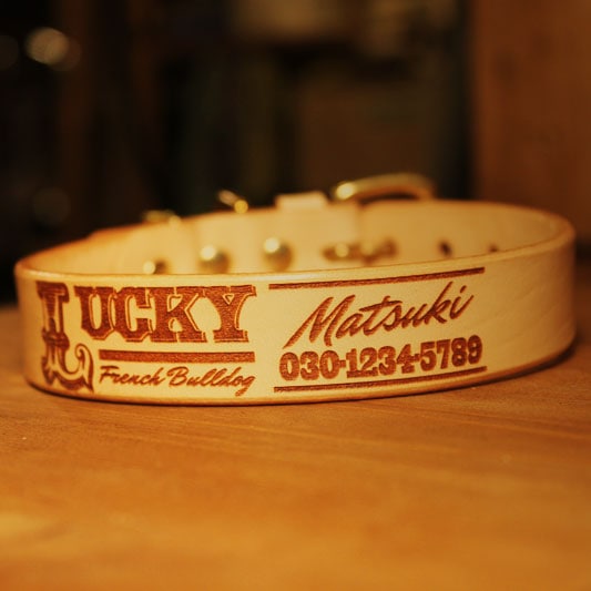 彫刻真鍮プレート付 おなまえ首輪 名入れ・電話番号 グラフィックプリント『Lucky Dog/福犬印』 本革首輪 真鍮無垢金具 サ...
