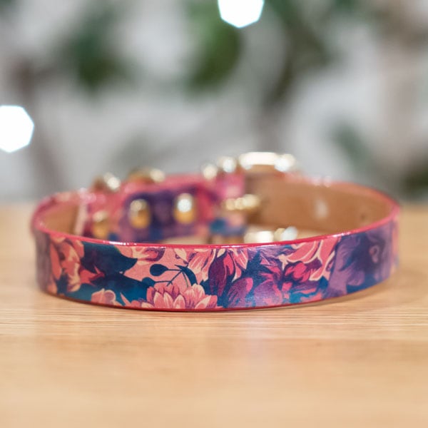 Framer エッジカラー(マゼンタ) アートなグラフィック本革首輪 パープルフラワー 真鍮無垢金具 サイズSS~L ベルト幅16...