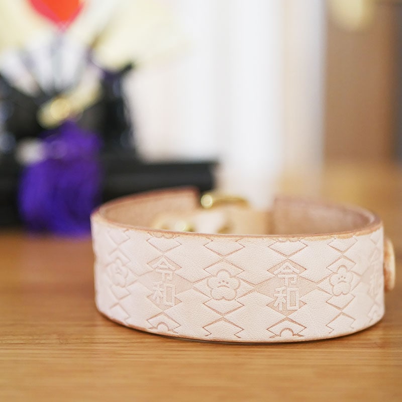 元号「令和」デザイン型押し WIDE 本革首輪 真鍮無垢金具 サイズSS~LL ベルト幅30mm 元号「令和」 梅の花柄 松皮菱文...