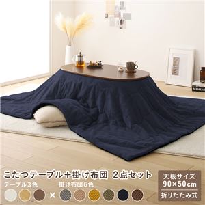 楕円形 折りたたみ こたつテーブル 2点セット 約幅90cm ナチュラル×ネイビー掛け布団 完成品送料無料