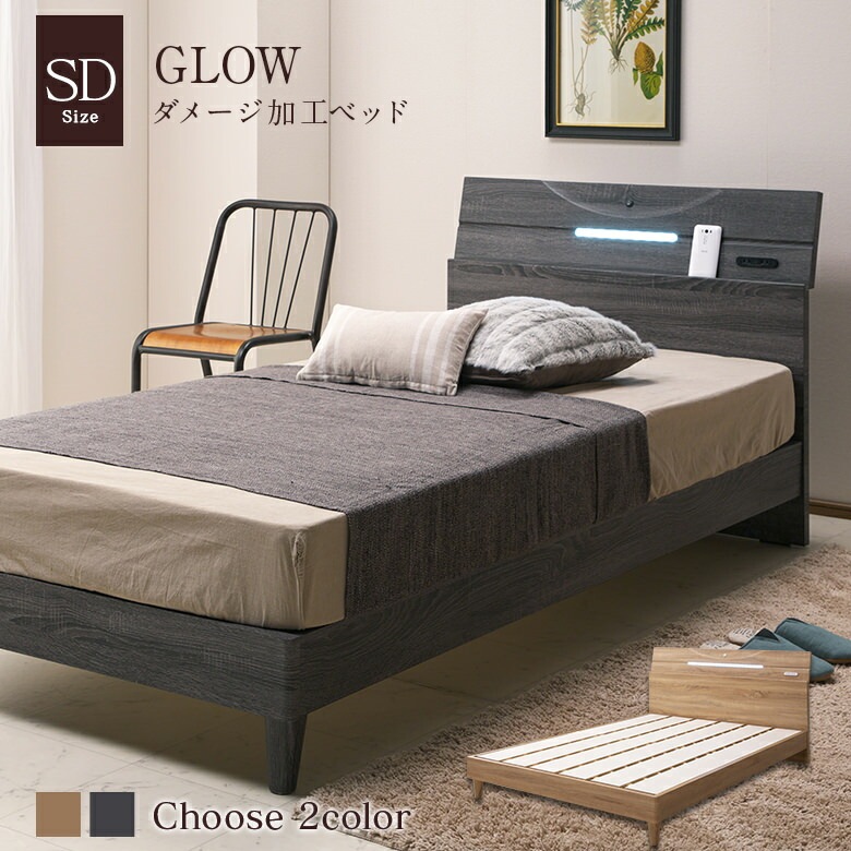 アンティーク調ベッド ヴィンテージ風 セミダブルベッド ダメージ加工 LEDライト付き コンセント付き 棚付き すのこベッド スノ...