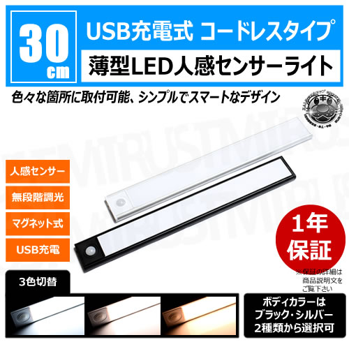 薄型 LED 人感 センサーライト 30cm 1本 ボディカラー ブラック シルバー【人感センサー 3色切替 無段階 調光 マグネ...