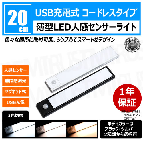 薄型 LED 人感 センサーライト 20cm 1本 ボディカラー ブラック シルバー【人感センサー 3色切替 無段階 調光 マグネ...