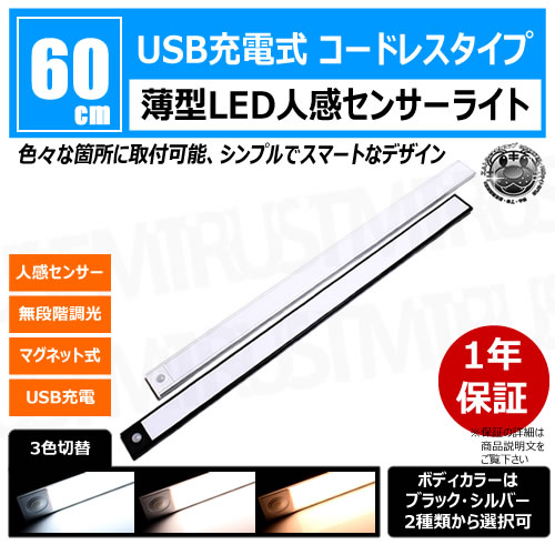 薄型 LED 人感 センサーライト 60cm 1本 ボディカラー ブラック シルバー【人感センサー 3色切替 無段階 調光 マグネ...