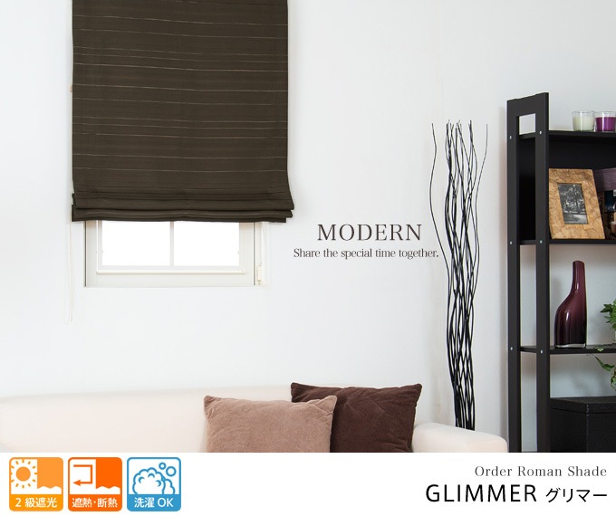 シックなカラーに光沢のあるボーダーが映える2級遮光ローマンシェード「グリマー」(ブラウン)