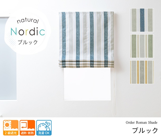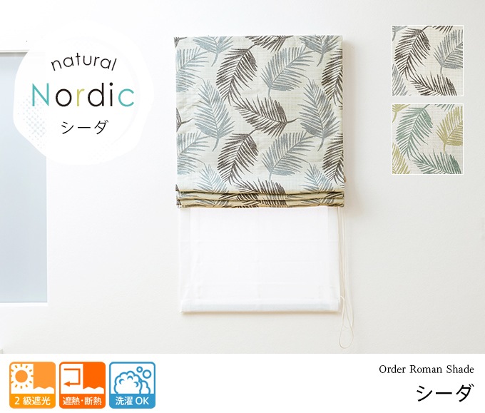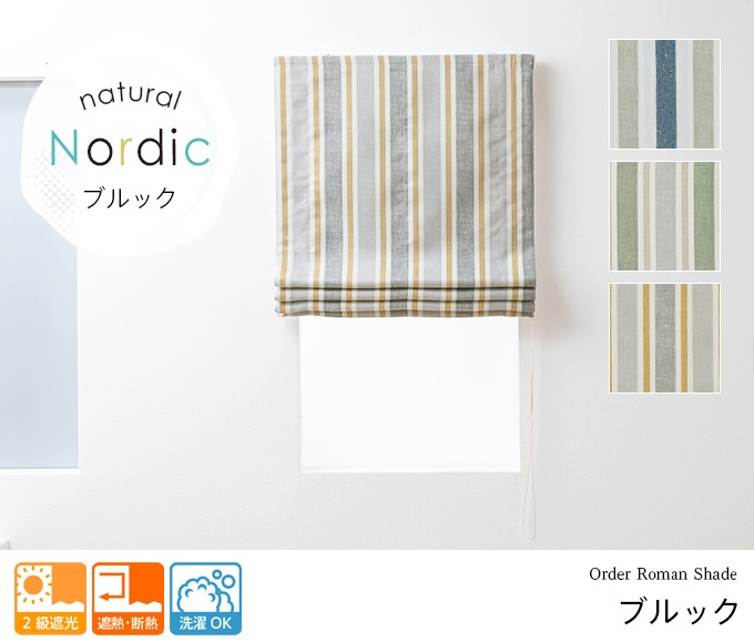 ナチュラル ノルディック ブルック(グリーン) オーダーローマンシェード/2級遮光 遮熱・断熱 洗濯OK 日本製
