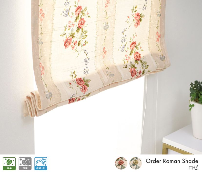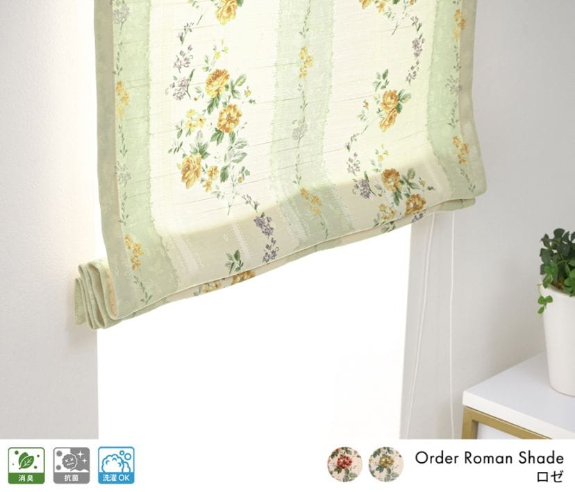 【幕体のみ】バラのデザインをプリントした小花柄ローマンシェード「ロゼ」グリーン【買い替え用】