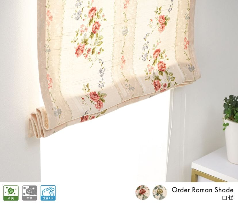 バラのデザインをプリントした小花柄ローマンシェード「ロゼ」ピンク