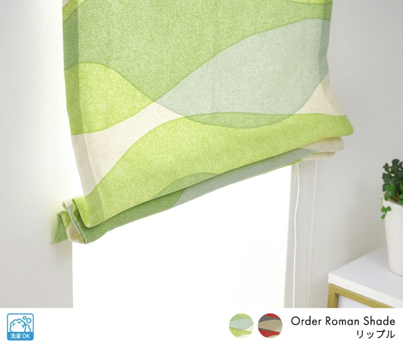 鮮やかなカラーリングのウェーブ柄プリントローマンシェード「リップル」グリーン
