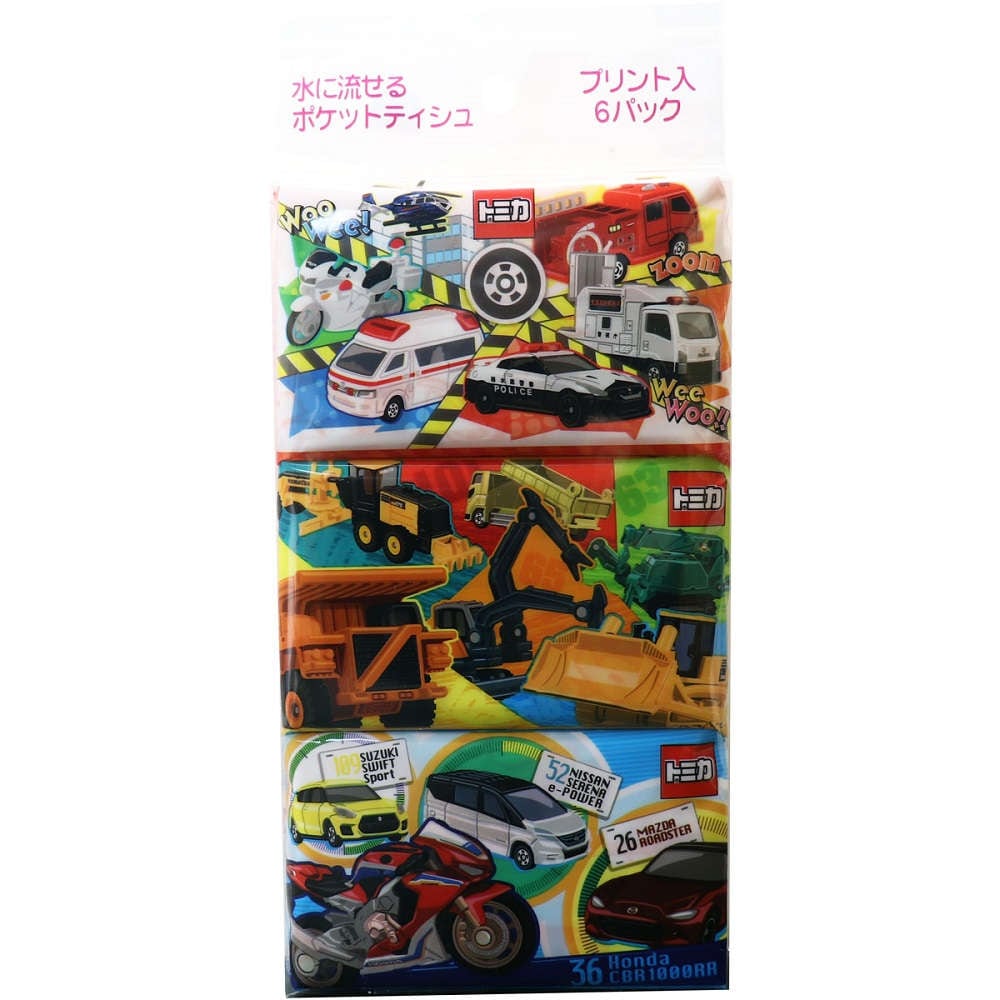 【ポケットティッシュ】 トミカ 水に流せるポケットティシュ 16枚(8組)×6個入