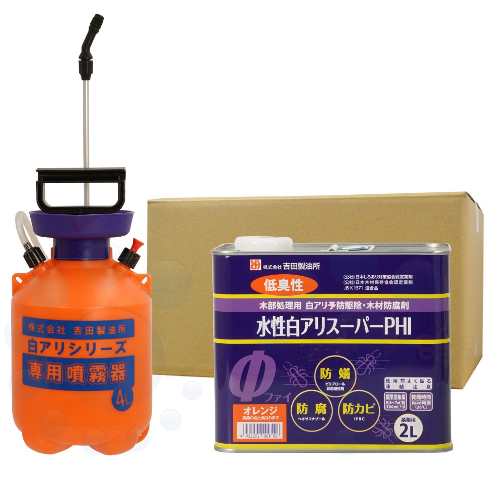 シロアリ駆除剤 水性白アリスーパーPHI 希釈済み 2L×3缶 オレンジ+4L専用噴霧器セット