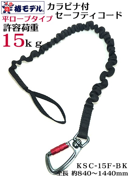 【椿モデル】カラビナ付 蛇腹 セーフティコード 15kg 平ロープ【セーフティコード】落下防止コード KSC-15F-BK【寅壱・...