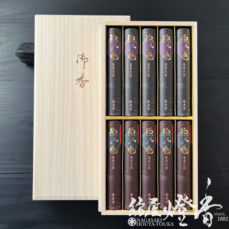 ご贈答/進物『香木二種【源氏之巻・麗香アソート/白檀・沈香-GENJInoMAKI-】桐箱10把入[微煙/有煙]』菊寿堂