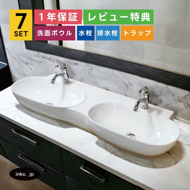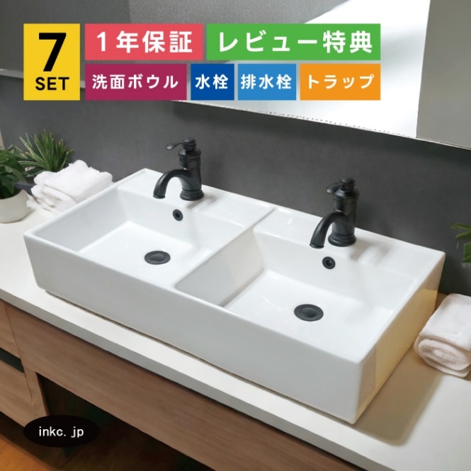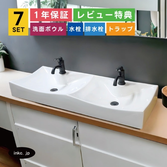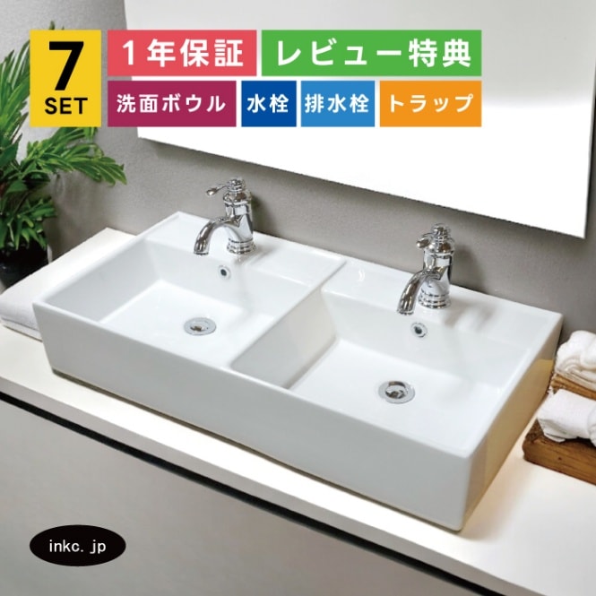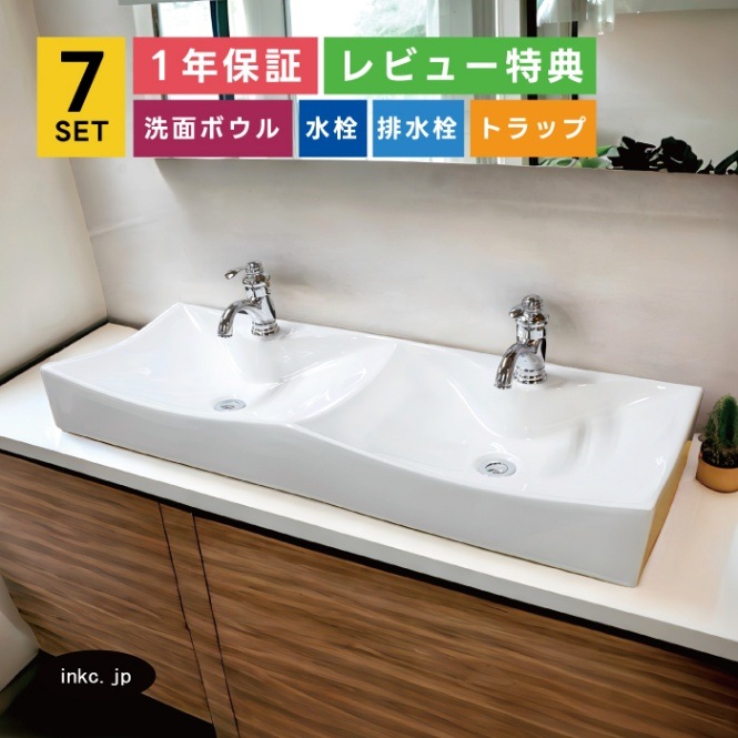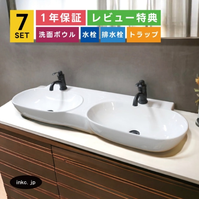 7点セット 2ボウル洗面+混合水栓+排水栓+排水トラップ 手洗い器 手洗い鉢 洗面台 置き型 陶器 ダブルボウル 大きい おしゃれ...