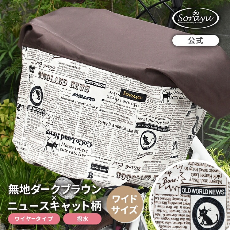 ワイドサイズ/無地ダークブラウン×ニュースキャット柄バスケットカバー