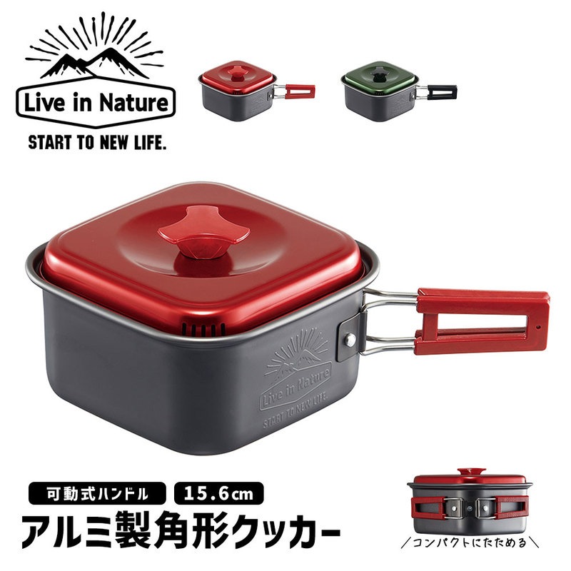 ラーメン鍋 キャンプ 目盛り付き 四角 アウトドア ラーメンクッカー 湯切り穴付き アルミ インスタントラーメン グリーン レッド...