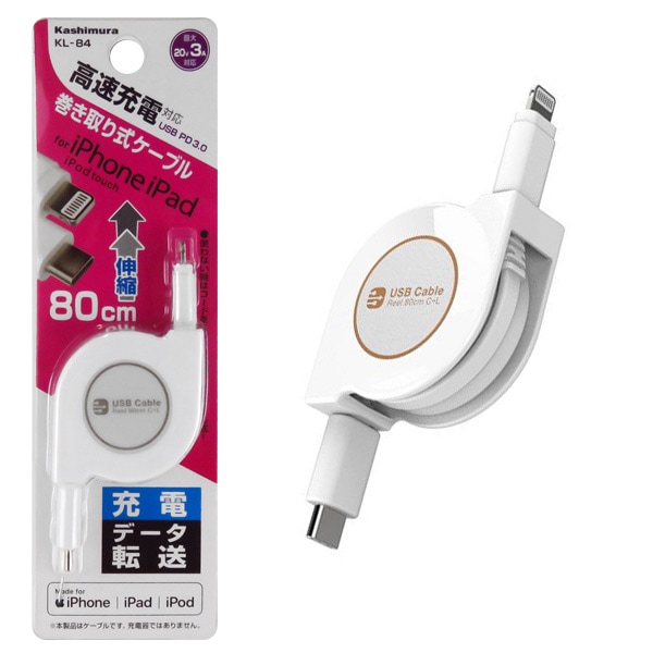 カシムラ Lightning/USB Type-C巻き取りケーブル 80cm USB PD 3.0 高速充電対応 Power de...