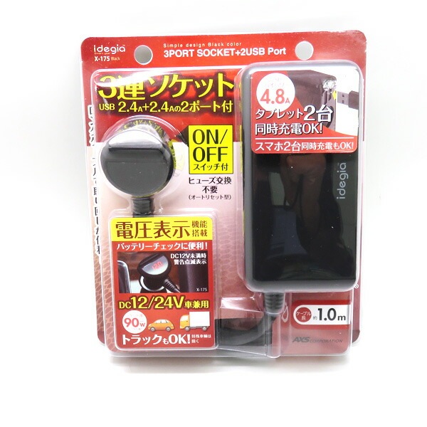 アークス:3連ソケット 車載用充電器 スマートフォン 電圧表示 DC12V DC24V/X-175