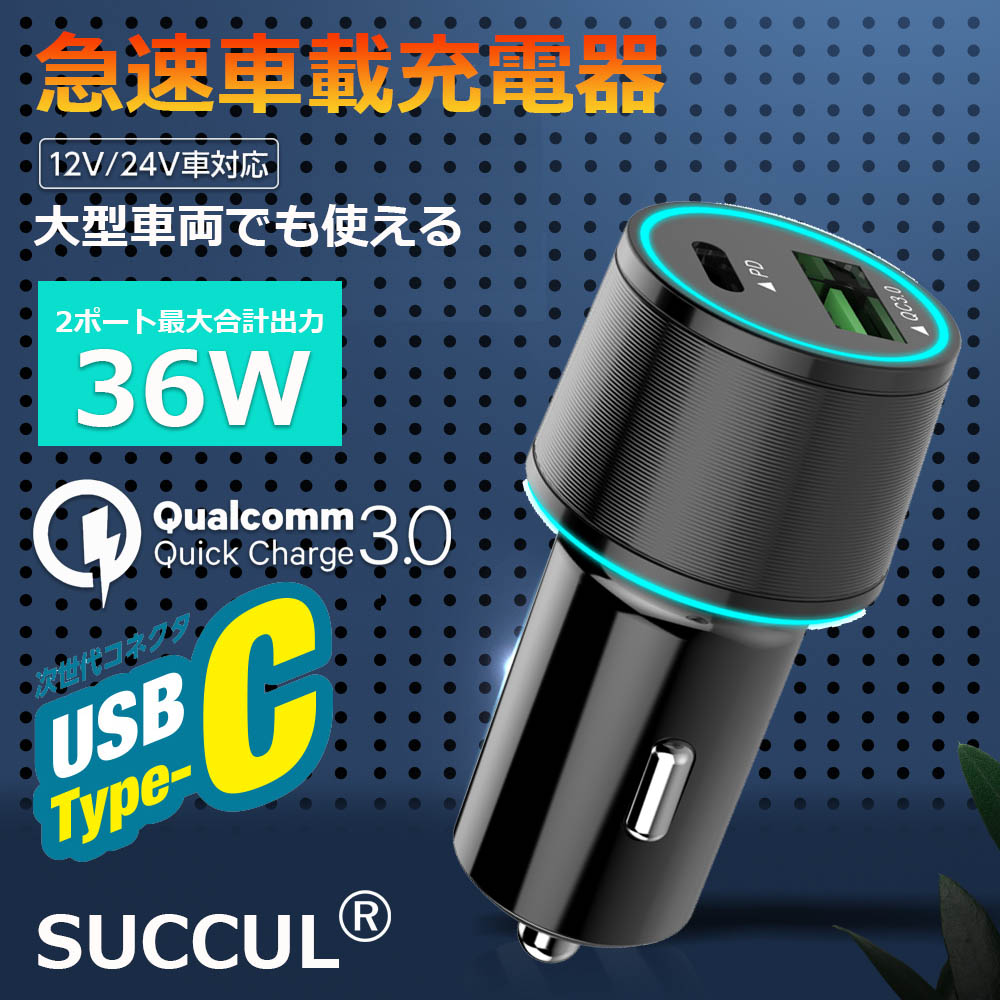 カーチャージャー シガーソケット PD対応 2ポート 2連 type-c 急速充電 車載 車 充電器 最大出力36W スマホ スマ...