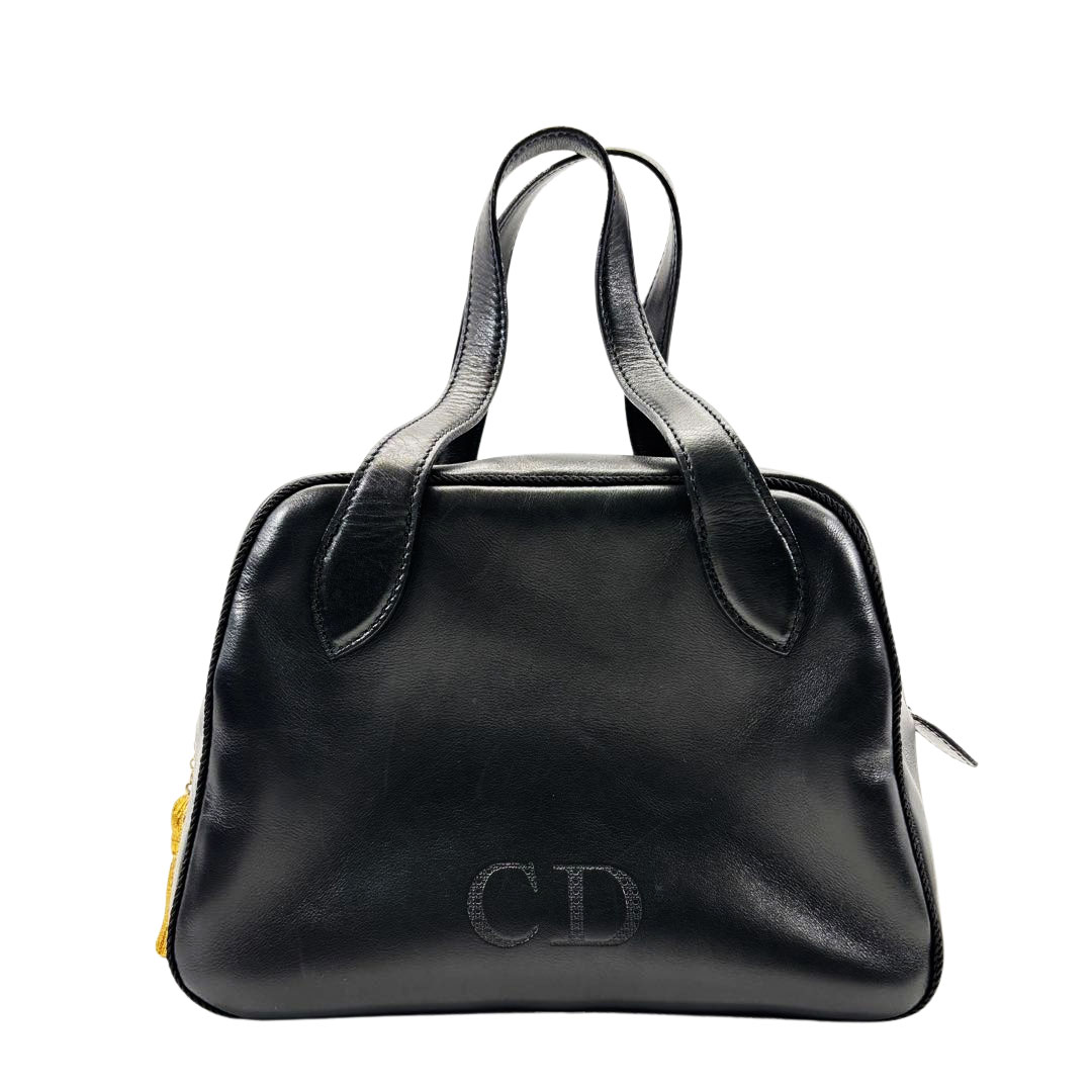 Christian Dior クリスチャンディオール スクエアハンドバッグ CDロゴ タッセルチャーム付き レザー ブラック/ゴー...