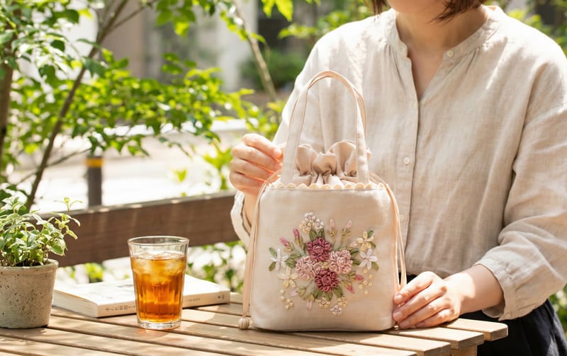 巾着バッグ リボン刺繍 約29×25×10cm [Rose Ruban]