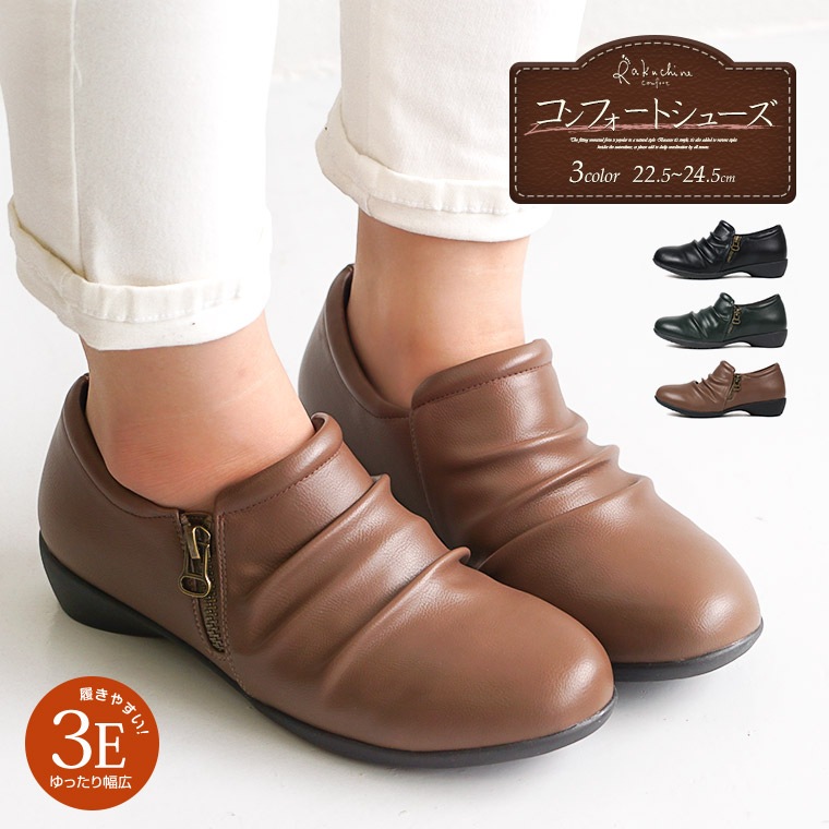 コンフォートシューズ レディース おしゃれ 幅広 3e 履きやすい サイドファスナー カジュアルシューズ 外反母趾 黒 ブラック ...