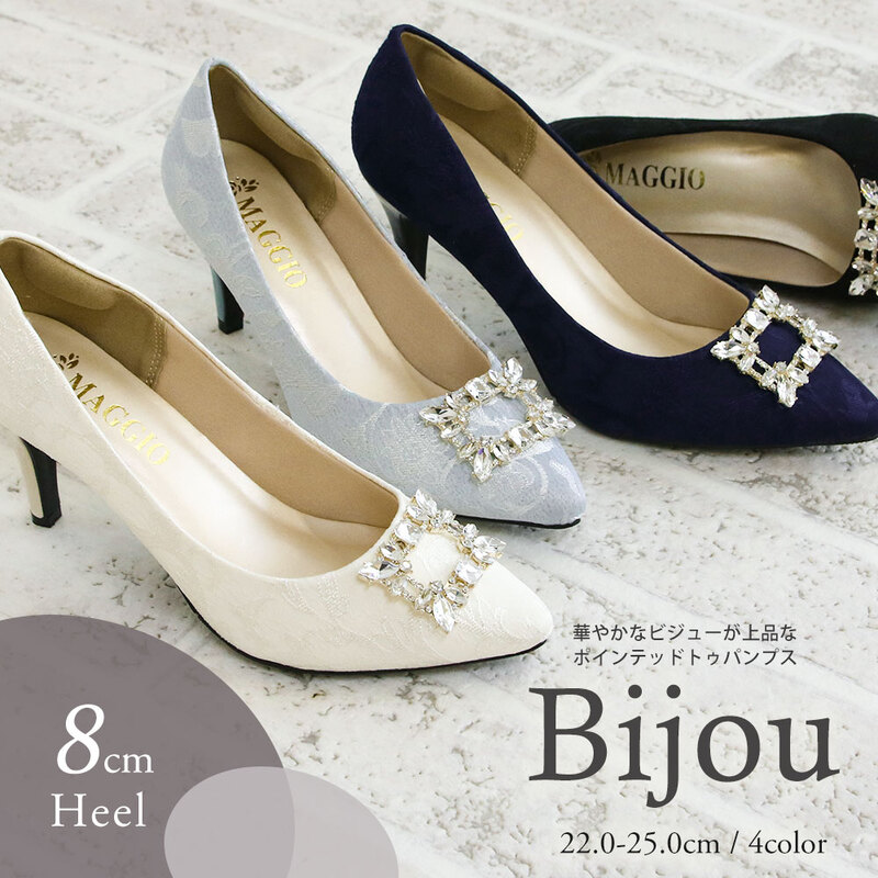 パンプス ポインテッドトゥ 8cmヒール ラインストーン ハイヒール 黒 ビジュー バックル ネイビー ブルー 青 アイボリー 白...