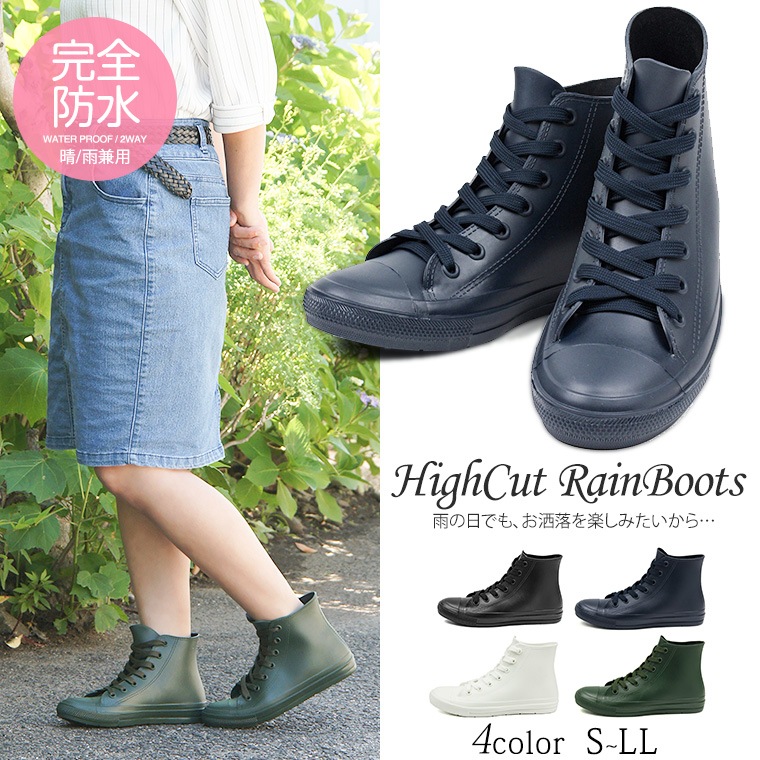 レインシューズ レディース レースアップ ハイカットスニーカー 晴雨兼用 黒 おしゃれ 長靴 雨 梅雨対策 通勤 通学 30080...