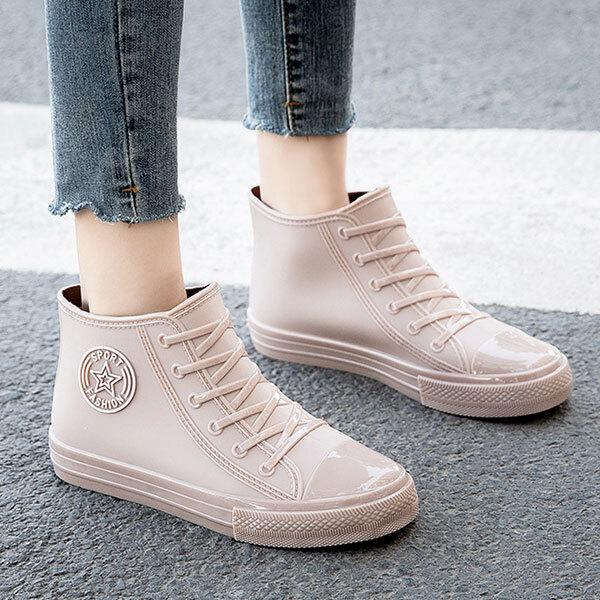 レディース レインシューズ ハイカット スニーカー 編み上げシューズ風 雨靴 ヒール 滑り止め加工 防水 弾力性 梅雨対策 柔らか...