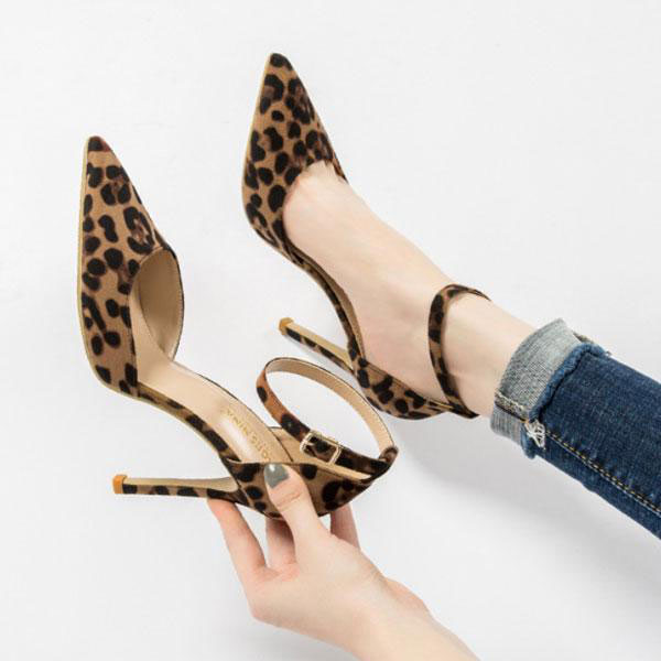 ポインテッドトゥ パンプス ヒール高さ3タイプ ストラップ仕様 セパレートタイプ スウェード素材 レオパード柄 レディース ピンヒ...