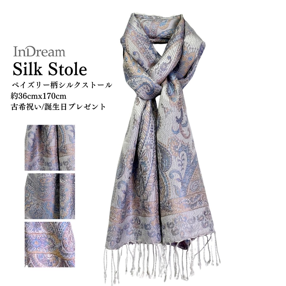 InDream ペイズリー柄 シルク ストール 小判 [36cmx170cm] シルバー ブルー 古希祝い 春 秋 冬 誕生日 ...