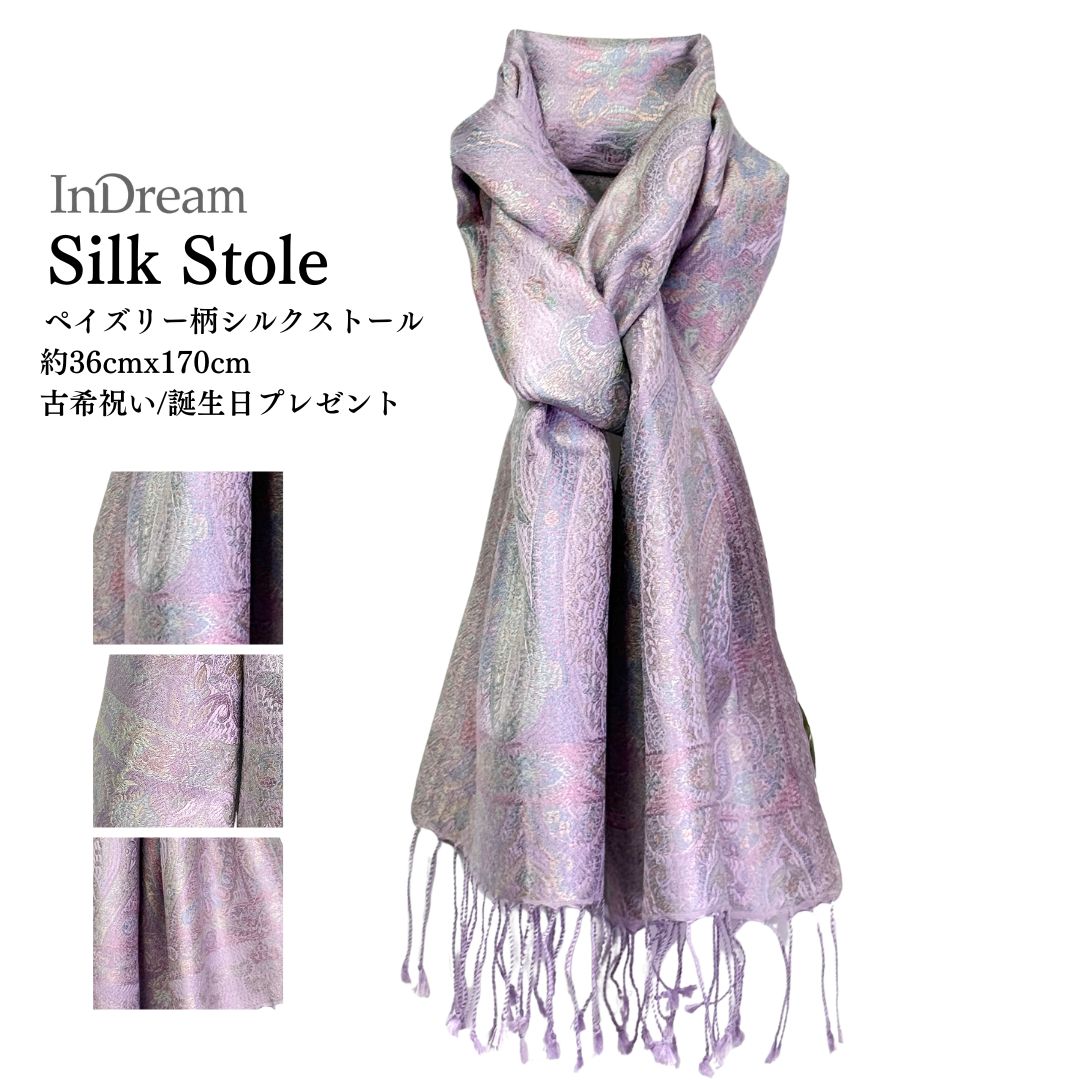 InDream ペイズリー柄 シルク ストール 小判 [36cmx170cm] ラベンダー パープル 古希祝い 春 秋 冬 誕生...