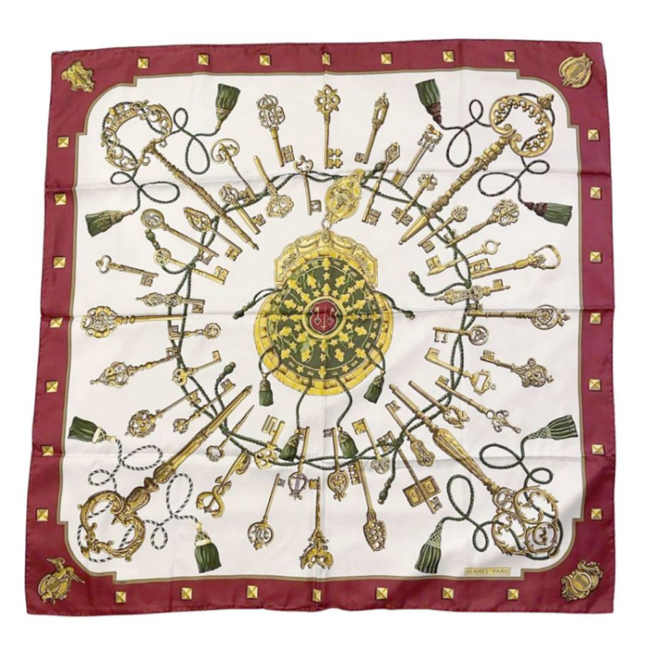 HERMES エルメス スカーフ カレ90 『LES CLES(鍵柄)』 シルク ホワイト ボルドー系