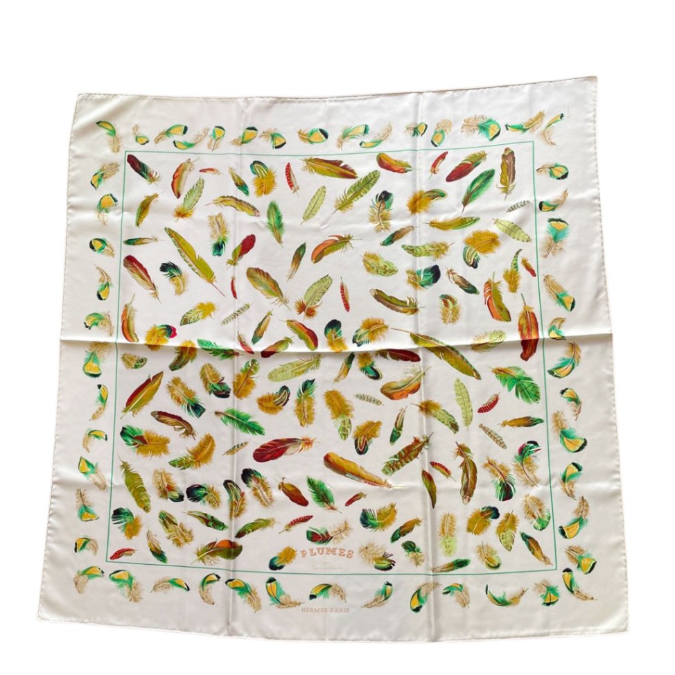HERMES エルメス スカーフ カレ90 『PLUMES(羽根)』 シルク ホワイト マルチカラー