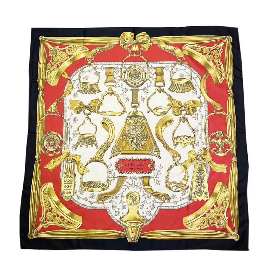 HERMES エルメス スカーフ カレ90 『ETRIERS(鎧・馬具柄)』 シルク ホワイト レッド ブラック ゴールド
