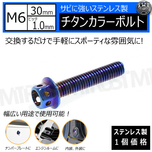 ステンレス製 チタンカラーボルト M6 30mm ピッチ 1.0mm 1個価格 【M6×30mm 自光式 ナンバープレート ナン...