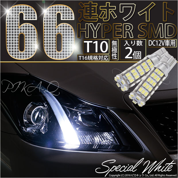【即納】【メール便可】T10 HYPER SMD 66連 ウェッジシングル LEDカラー:ホワイト 無極性 1セット2個入