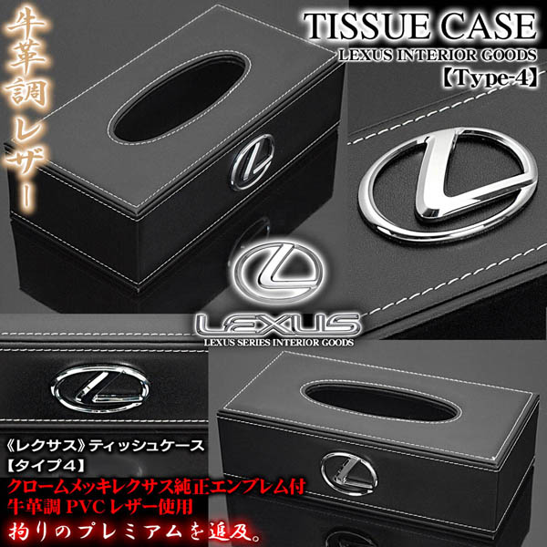 《LC/LFA/RC/SCレクサス》ティッシュケース/牛革調PVC合成レザー【タイプ4/ブラック】レクサス純正メッキエンブレム付/...