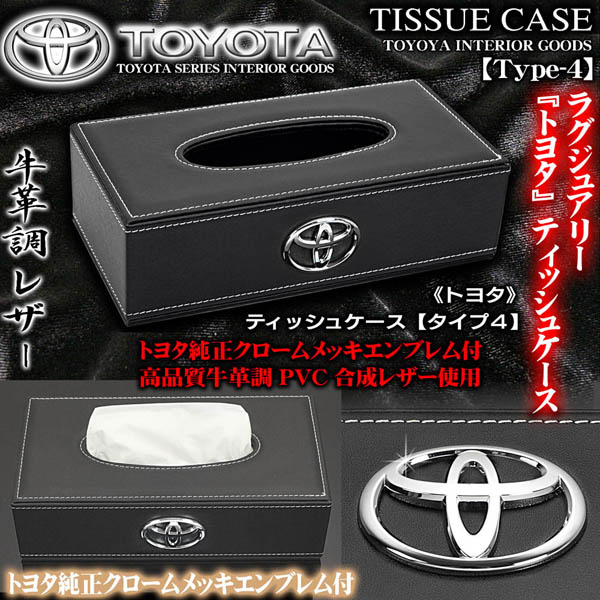 《トヨタ》ティッシュケース【タイプ4】ブラック牛革調PVC合成レザー[トヨタ純正メッキエンブレム付]ブラガ