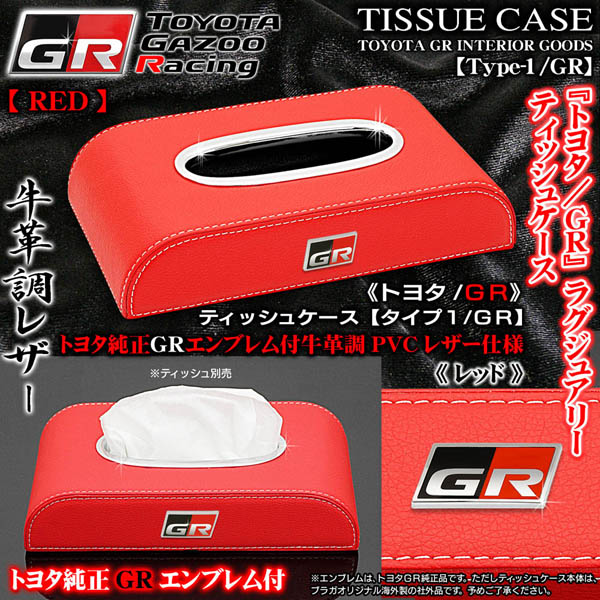 タイプ1/GR《トヨタGR》レッド/ティッシュケース/牛革調PVCレザー/トヨタGR純正エンブレム付/欧米仕様客注品/ブラガ