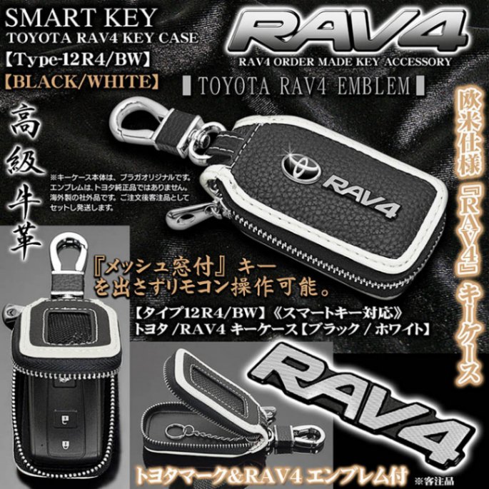 【タイプ12R4/BW】トヨタ/RAV4 キーケース/牛革製[ブラック/ホワイト]Tマーク&RAV4エンブレム付/キーホルダー/窓...