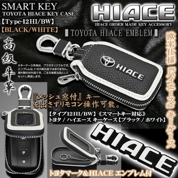 【タイプ12HI/BW】トヨタ/ハイエース キーケース《ブラック/ホワイト》Tマーク&HIACEエンブレム付/キーホルダー/窓付/...